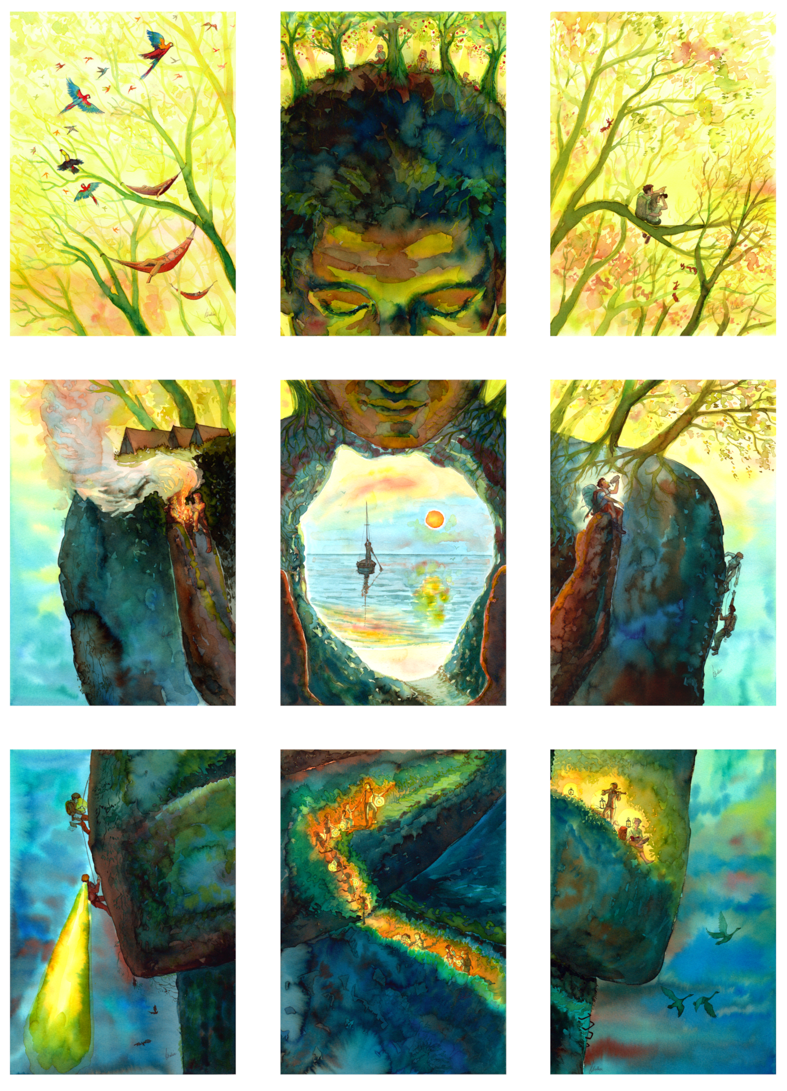 Caverne Plante Château Ville Neige Lanterne Roche Arbres Pissenlit Baleine Illustrations à l’encre sur papier A4 Ces illustrations ont été…